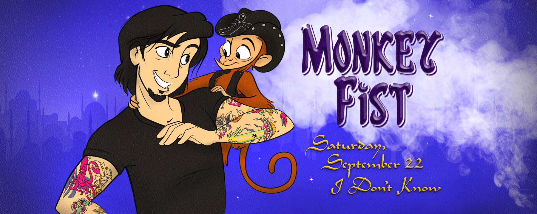 As I was growing my hair out, it definitely entered an Aladdin-looking phase. I Disney-fied myself, added Sean's trademark vest and cowboy hat, and voilà: a banner was born.